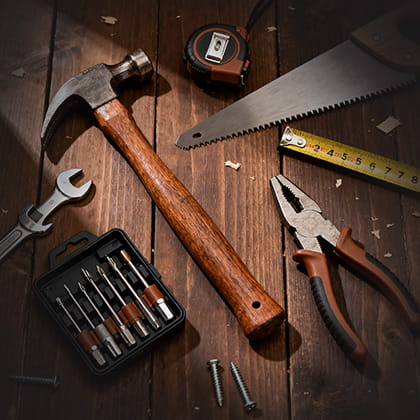 Unser Werkzeug-Sortiment umfasst alle Arten von unverzichtbaren Handwerkzeugen wie Schraubenschlüssel, Hammert, Bohrmaschinen usw., die Sie bei Reparaturen und Bauarbeiten rundum unterstützen.