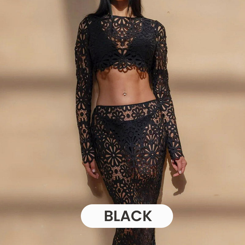 MONIPUOLINEN KAKSIOSAINEN ASU: Tämä setti sisältää yhteensopivan pitsisen yläosan ja hameen, joiden avulla voit vaivattomasti luoda yhtenäisen ja tyylikkään ilmeen. Sopii erilaisiin tilaisuuksiin, illanistujaisista juhlapäiviin.