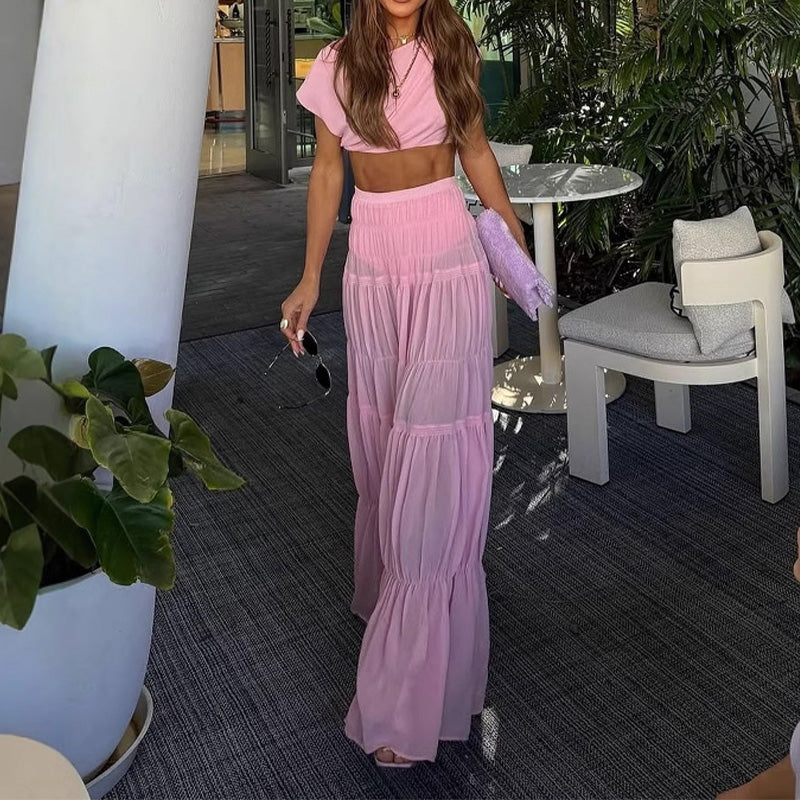 Atemberaubendes Chiffon-Crop-Top mit gerüschter Schulter und mehrlagigem A-Linien-Maxirock mit elastischer Taille