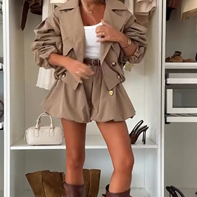 SCHICKES ZWEITEILIGES SET: Dieses abgestimmte Outfit besteht aus einer kurzen Jacke im Trenchcoat-Stil und passenden Shorts und bietet ein komplettes und stilvolles Ensemble. Es sorgt für einen stimmigen Look für verschiedene legere oder halb-legere Anlässe.